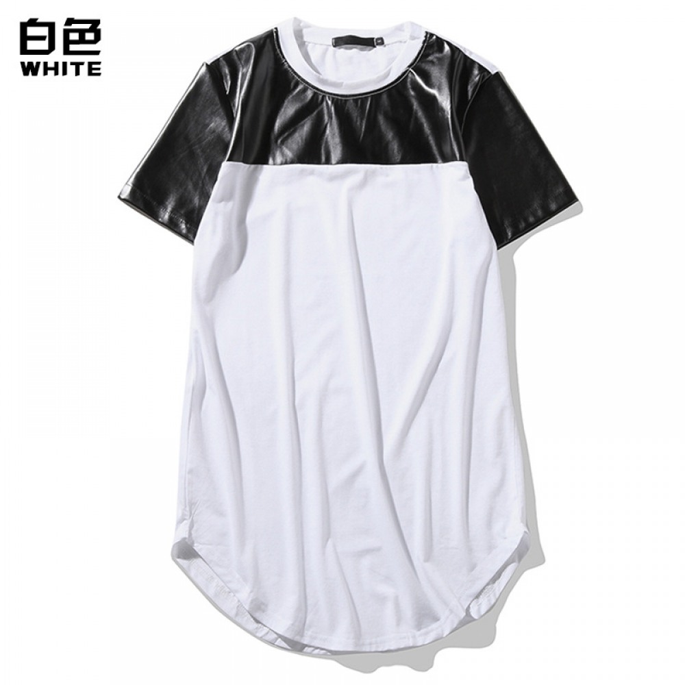 Flat Summer New Men's Round Neck Short-Sleeved High Street Arc Hem Solid Color Leather T-Shirt